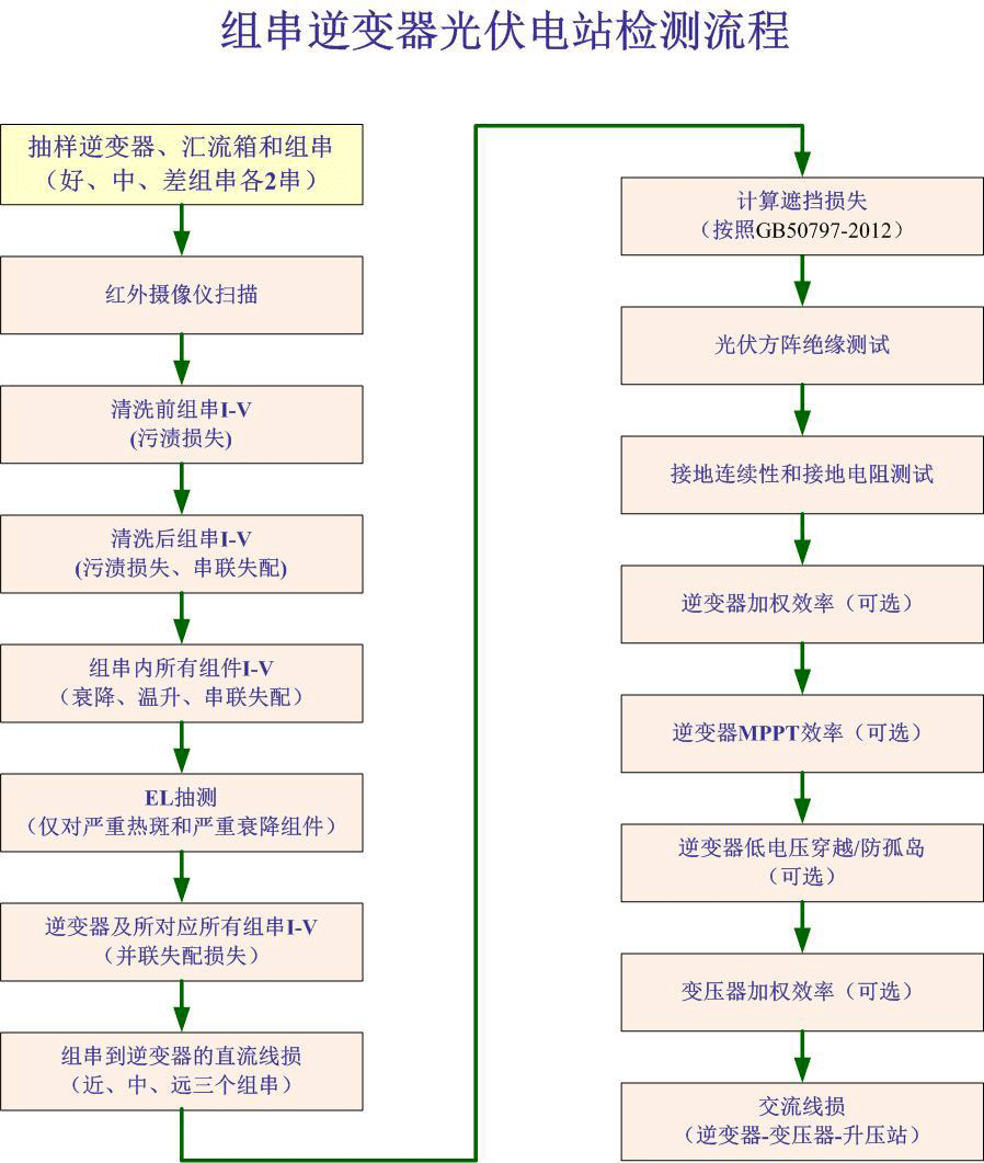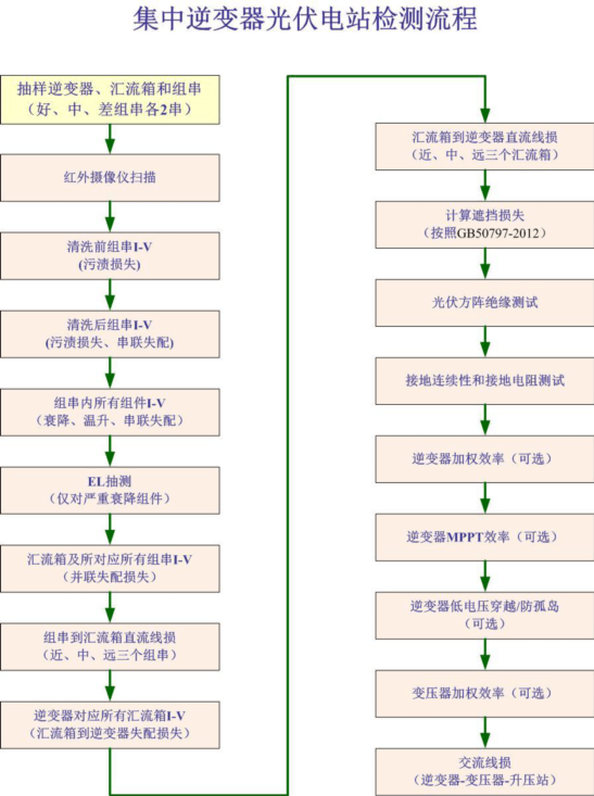 對(duì)于光伏電站第三方檢測(cè)機(jī)構(gòu)或者運(yùn)維服務(wù)公司等,一般會(huì)參考“規(guī)范”第九章節(jié) 光伏電站性能測(cè)試內(nèi)容進(jìn)行測(cè)試。參考眾多光伏檢測(cè)機(jī)構(gòu)的主要檢測(cè)項(xiàng)目,在光伏電站現(xiàn)場(chǎng)可開(kāi)展的檢測(cè)項(xiàng)目包括:紅外攝像(熱斑檢查),污漬遮擋損失,光伏組件性能衰降,光伏組串溫升損失,光伏組件/組串的串并聯(lián)失配損失,EL測(cè)試,光伏方陣相互遮擋損失,直流線損,交流線損,光伏方陣絕緣測(cè)試,接地連續(xù)性測(cè)試,逆變器效率,并網(wǎng)點(diǎn)電能質(zhì)量。對(duì)于諸如逆變器MPPT效率,變壓器效率,并網(wǎng)性能測(cè)試(孤島保護(hù)、有功/無(wú)功功率控制能力、低電壓穿越以及電壓/頻率適應(yīng)能力驗(yàn)證)等測(cè)試內(nèi)容,由于更多涉及的是并網(wǎng)環(huán)節(jié),或在現(xiàn)場(chǎng)無(wú)法開(kāi)展的項(xiàng)目。