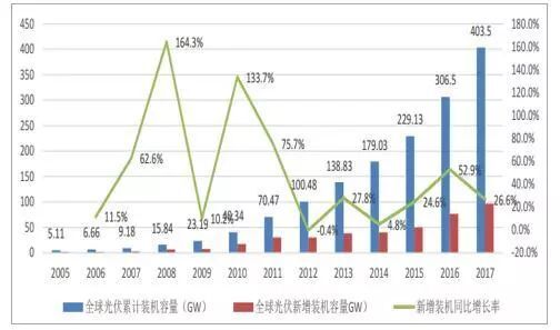 2009 年全球光伏總裝機規(guī)模為 23GW, 2017 年累計裝機規(guī)模達(dá)到 400GW,十年的時間光伏行業(yè)正在突飛猛進(jìn)的發(fā)展。